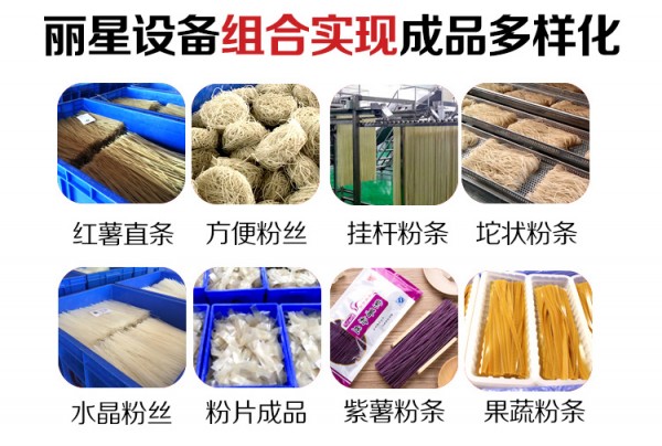 丽星红薯粉条机配置可靠,自带冷库和烘干系统,设备工艺可靠,历经12道生产工艺制粉,做到省时省力,红薯粉条机涂布式工艺流程:淀粉打浆-真空抽气-下料入机-铺浆-蒸熟-冷却-低温老化-自然老化-竖切丝-烘干-定长横切-整理包装