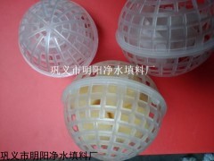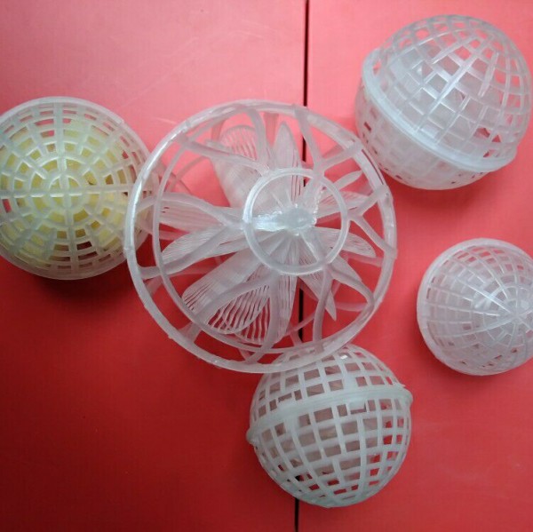 多孔球型悬浮填料是对处理污水,生物膜法采用的多种填料中开发的新系列产品。悬浮球填料中有聚乙烯或聚丙烯材料注塑而成,分内外双层球体,外部为中空鱼网状球体,内部为转型球体,在使用过程中,微生物易生成、易更换、耐酸碱、抗老化,不受水流影响,使用寿命长,剩余污泥少,安装方便。