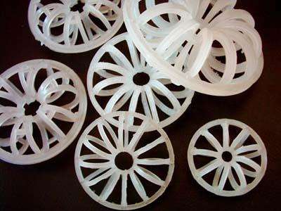 花环填料也称梅花环填料是由许多圆环结绕而成,由于填料的空隙处能有较高的持液量,可使塔内液体的停留时间较长从而增加了气液两相的接触时间,提高了填料的传质效率。聚丙烯填料具有空隙率大,压降和传质单元高度低,泛点高,汽液接触充分,比重小,传质效率高等特点,多用于气体洗涤、净化塔中。