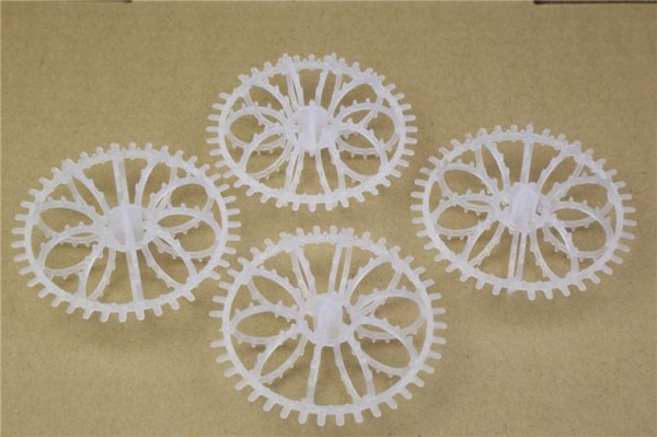 塑料泰勒花环填料的构思是不使下流的液体有流动死角,尽量提高填料的有效面积。由于有很多弯曲枝叉和结合点,使液体能在填料层中均匀分布。其结构上的特点使填料压降小,这样能达到节能目的。它不仅抗腐蚀,而且强度好,由于材质轻,便于安装。 其主要特点是空隙率大,不易被堵塞,通量大、阻力小等优点,且间隙处有较多的滞液量,使塔内液体停留时间较长,增加了气液接触时间,提率明显。