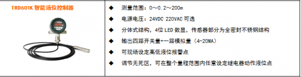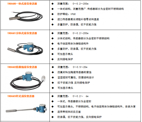 TRD600系列产品可分为一体式,分体式,防腐蚀型,杆式液位变送器及智能液位控制器等,是目前通用的液位测量仪表。产品通过高性能压力传感器,把与液位深度成正比的液位静压力准确测量出来并转换成标准信号输出,可直接与二次显示控制仪表、智能仪表或PLC等相连。安装方便,直接投入液体介质,即可测量出变送器顶端到液面的液位高度。其中,智能液位控制器可输出一路模拟量和四路开关量实现控制功能。目前该系列产品已广泛使用于石油、化工、电厂、城市供水、水文勘探领域的液位测量与控制中。