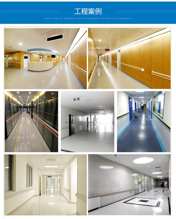 防撞扶手是由PVC面板与铝合金底衬加底座组合而成,它具有抗菌,防火,耐磨,护墙,防滑功效。适用于医院,养老院等公共场所。不仅能帮助病残体弱者支撑行走,还能起到保护墙体的作用。