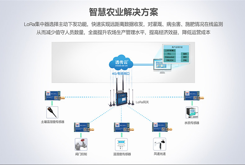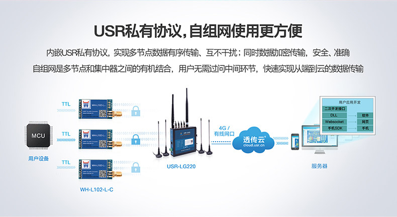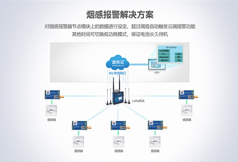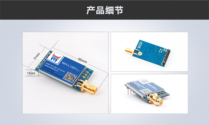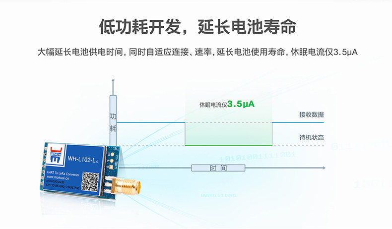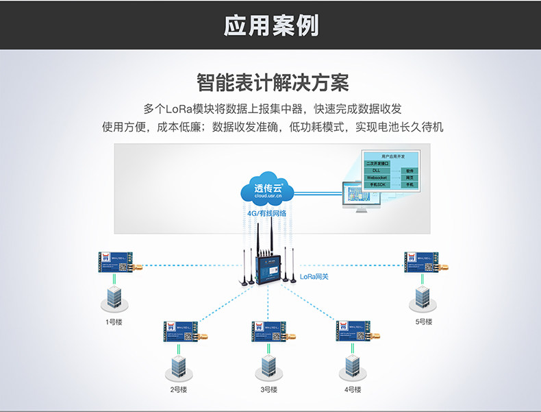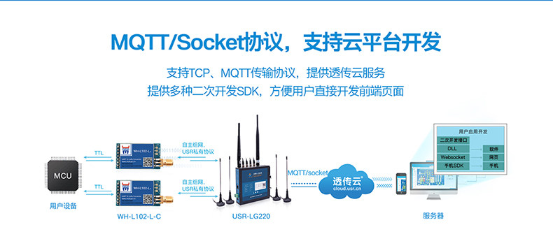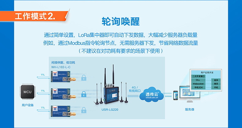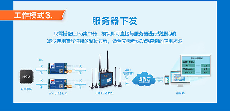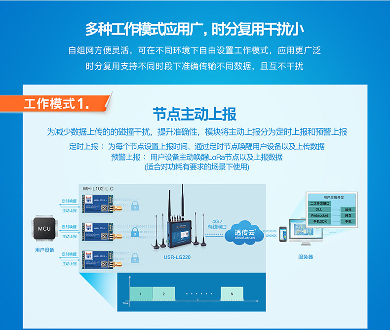 LoRa星型组网模块WH-L102-L-C采用,USR私有协议,自组网使用更方便内嵌USR私有协议,实现多节点数据有序传输、互不干扰 ;同时数据加密传输,安全、准确自组网是多节点和集中器之间的结合,用户无需过问中间环节,快速实现从端到云的数据传输。 多种工作模式应用广,时分复用干扰小自组网方便灵活,可在不同环境下自由设置工作模式,应用更广泛时分复用支持不同时段下准确传输不同数据,且互不干扰。 节点主动上报为减少数据上传的的碰撞干扰,LoRa星型组网模块将主动上报分为定时上报和预警上报定时上报:为每个节点设置上报时间,通过定时节点唤醒用户设备以及上传数据 预警上报:用户设备主动唤醒LoRa节点以及上报数据 (适合对功耗有要求的场景下使用) 轮询唤醒通过简单设置,LoRa集中器即可自动下发数据,大幅减少服务器负载量。 例如,通过Modbus指令轮询节点,无需服务器下发,节省网络数据流量 (不建议在对功耗有要求的场景下使用)LoRa星型组网模块WH-L102-L-C的服务器下发只需搭配LoRa集中器,模块即可直接与服务器进行数据传输,减少使用有线连接的繁琐过程,适合无需考虑功耗控制的应用领域 MQTT/Socket协议,支持云平台开发支持TCP/MQTT传输协议,提供透传云服务 提供多种二次开发SDK,方便用户直接开发前端页面 远距离数据传输实测2000米数据收发,传输迅速,信号稳定 (晴朗,空旷,20dBm发射功率,天线增益2.5dBi,高度大于2m,0.268K空中速率) 低功耗开发,延长电池寿命模块可在低功耗模式下实现超长待机,功耗仅为3.5μA