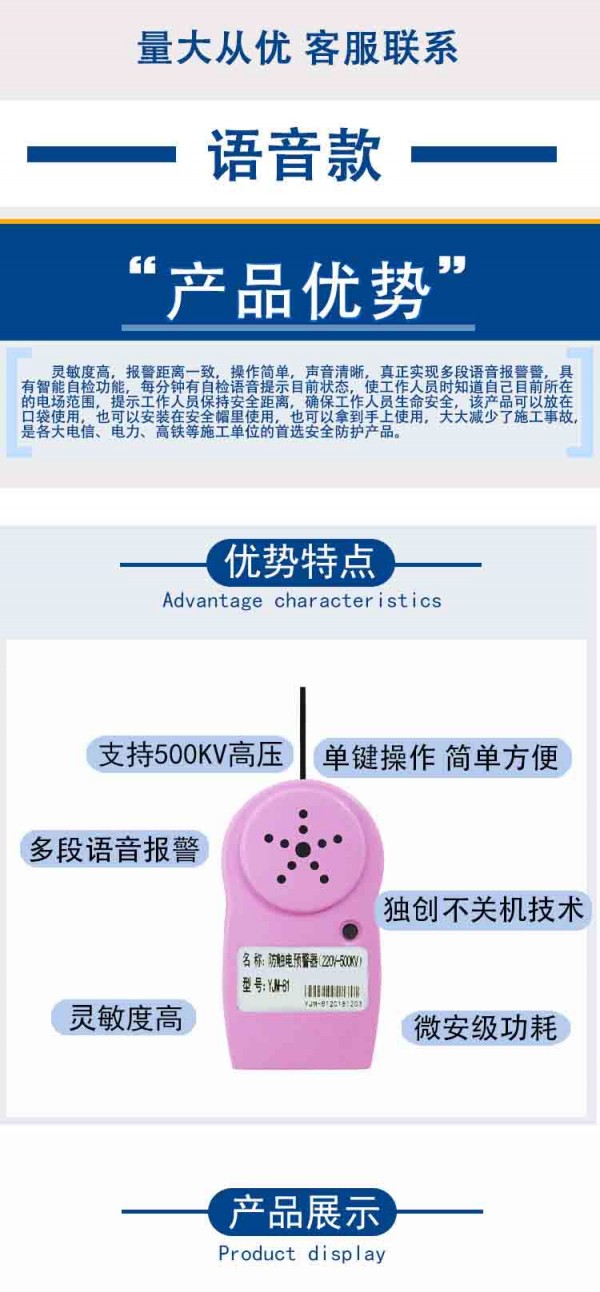 1.报警方式:语音报警,有开机、关机、语音报警、电压档位播报、自检、电量提示等多段语音提示。