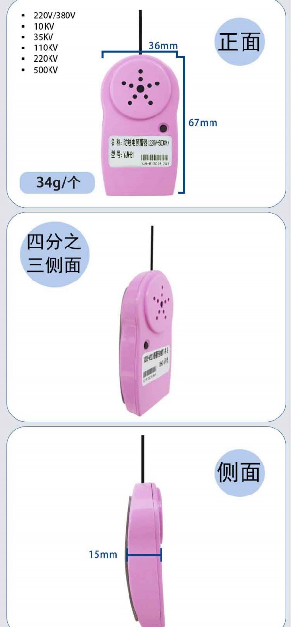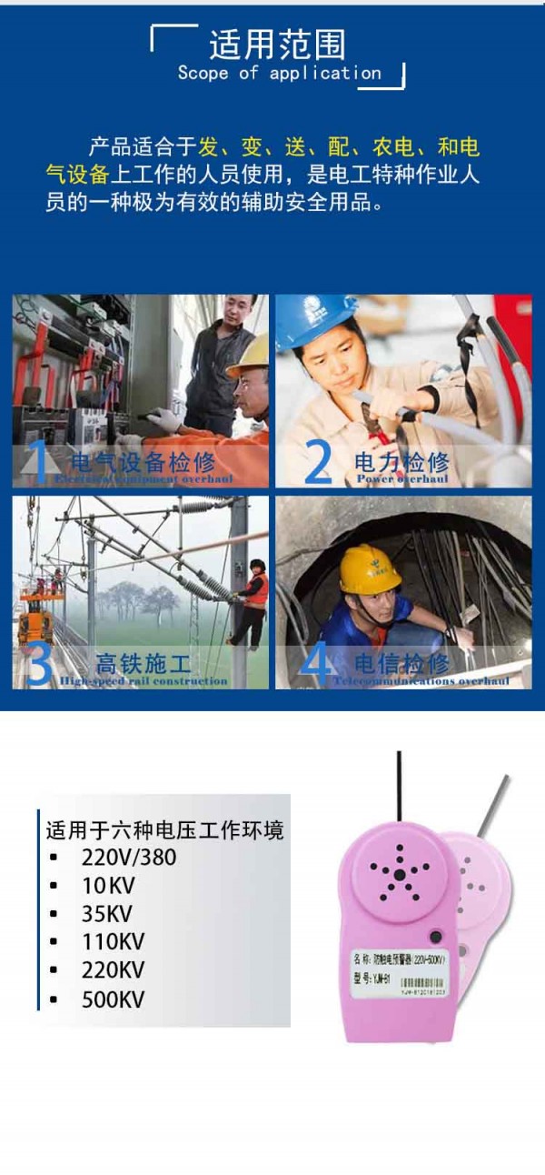 2.支持电压220/380V、10KV、35KV、110KV、220KV、500KV电压,预警器为六档电压选择,无波段开关、一键式电子切换电路安全可靠。