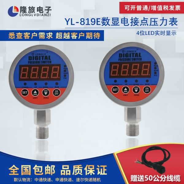 YL-819E是一款80mm不锈钢外壳的数显电接点压力表(外壳材质304不锈钢)用于替代机械式电接点压力表。这款电接点压力表主要是为了取代传统机械式电接点压力表,特别适合使用在压力冲击频繁,现场振动强烈的工况场合。具有抗震动,寿命长,操作简单,显示清晰等特点