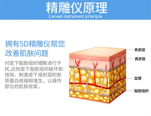 5d精雕仪减肥原理和操作视频多功能仪器强力爆脂、去除脂肪 利用聚集了强烈声波的强声波头发射的频率达 40000HZ 的声波,进入人体后可使人体脂肪细胞产生一种强烈的撞击作用及脂肪细胞间的摩擦运动,