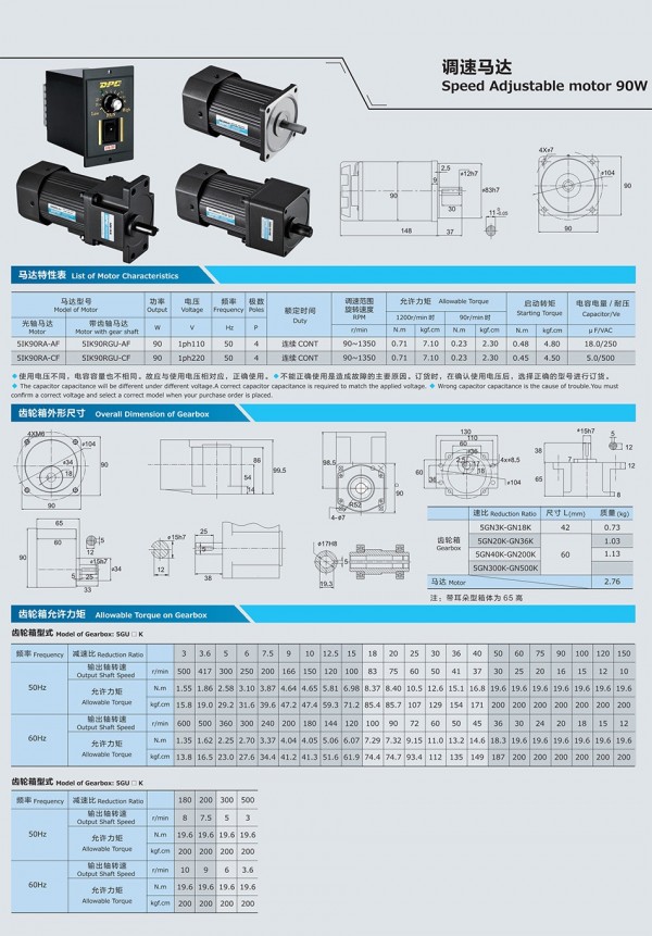 程鑫调速减速电机90W使用须知: