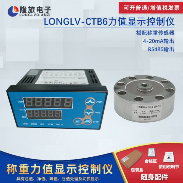 LONGLV-CTB6力值显示控制仪配接4线制电阻应变桥式传感器,具有总值、净值、峰值、谷值处理及切换显示,10点折线修正功能。标配1点开入,可通过参数选配不同功能(清零、去皮、比较值允许输出、显示锁定或峰谷值清零);标配报警为2点OC门输出。可实现多组态控制。可选配变送、通讯功能。