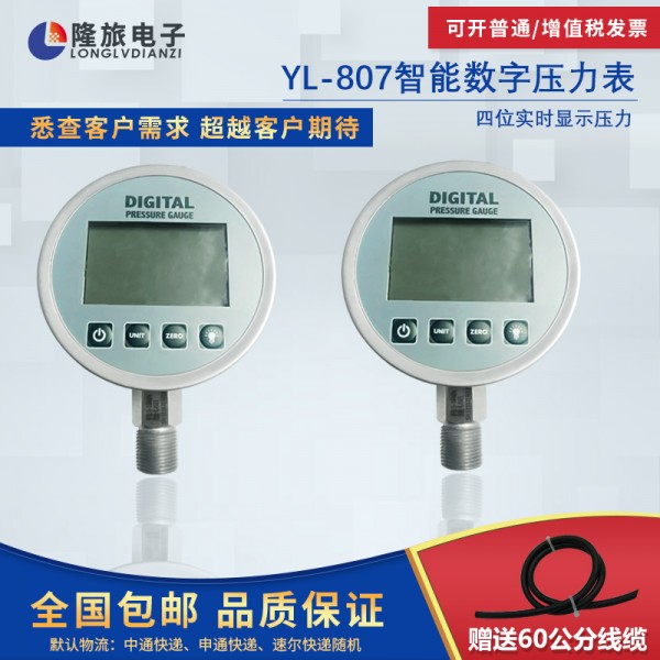 YL-807是一款智能型数字压力表,内置压力传感器,能够准确的实时显示压力,并且具有精度高、长期稳定性好的特点。该款数字压力表配备5位显示的大尺寸LCD液晶显示,具有清零、背光、开关机、单位切换、低电压报警、峰值记录等多种功能,操作简单,安装方便。