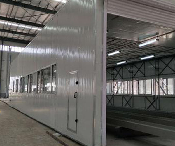 一种是侧进风(或房顶部)、侧排风。这种排风设计管道在房体之外,长度与整体移动房体的行程相同。外侧排风管道上设若干个电动风阀,而在房体侧面设置若干个喷漆或打磨工位,并在此处通过伸缩汽缸实现与排风管道的自动对接。漆雾收集采用玻纤地棉过滤,过滤棉框嵌入喷漆房墙体的排风一侧,而另一侧墙体或者房顶设置进风过滤系统。整体移动喷漆房方便工件取放