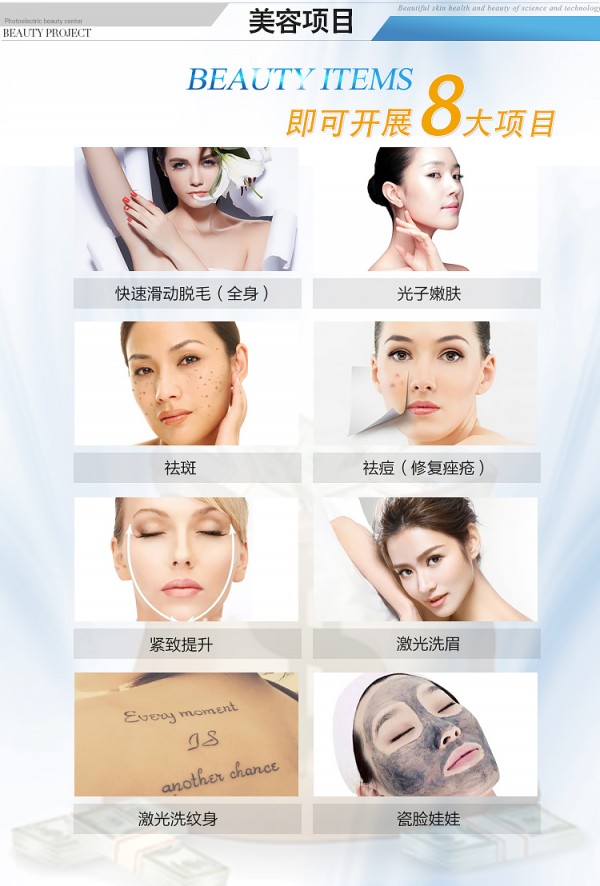1.无痛冰点脱毛、2.祛斑、3.光子嫩肤、4.祛痘