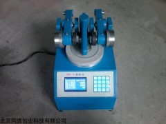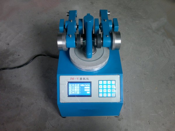 是将二个相距规定距离的磨耗砂轮与安装在水平转盘上的试件样板相接触,并使二砂轮的中心轴线与转盘的中心轴线不处于同一平面内。当转盘旋转时,左侧一个磨耗砂轮产生由外侧向样板表面中心的摩擦,而右侧一个磨耗砂轮产生由样板表面 中心向外侧的摩擦。当转盘连续旋转时,在样板表面就形成了一系列呈网型相交的圆环摩擦痕迹。采用这种磨耗布置方式,使样板表面各个方向都受到磨擦避免了一个方向往复运动的磨耗仪磨擦有明显的方向性缺陷,使磨耗评价更具客观性。