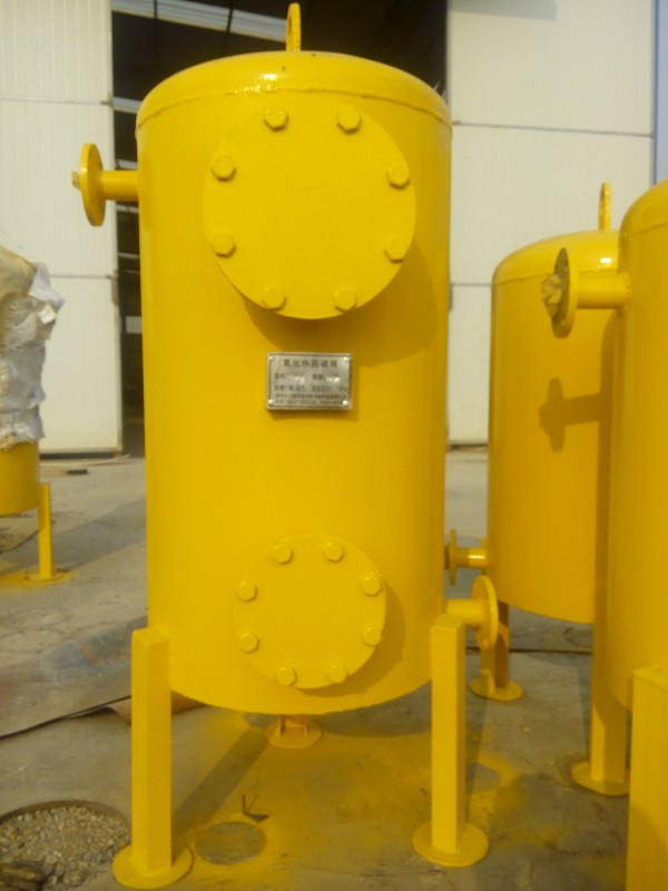 干法脱硫是在圆柱状脱硫塔内装填一定高度的脱硫剂,沼气自下而上通过脱硫剂,H2S被去除,实现脱硫过程,水处理厂常用的脱硫剂为氧化铁,其粒状为圆柱状,氧化铁脱硫的原理如下: