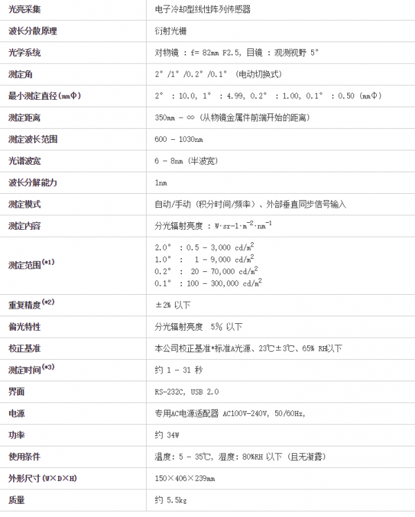 ■ 和本公司其他型号的分光辐射度计一并使用时,能够测定可见光~近红外光(380~1030nm)的分光分布。