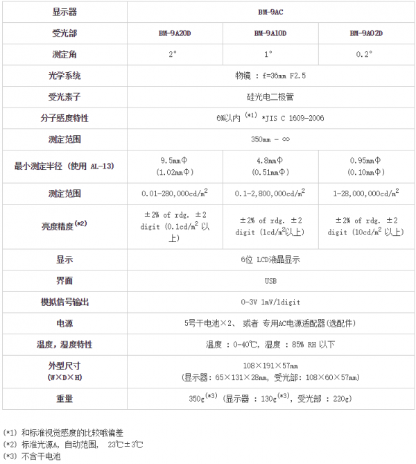 TOPCON拓普康亮度计BM-9A日本直接进口为轻盈紧凑型手持式亮度计。光亮探头可选择3类不同的测定角度,用途广泛。此外,光亮探头可以与本体分离,因此同样适合安装于自动测量系统,并适合产线使用。