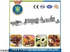 工艺流程: 原料配制→拌粉→挤压膨化→注心→切断机→输送→干燥→喷油→调味→(包装)