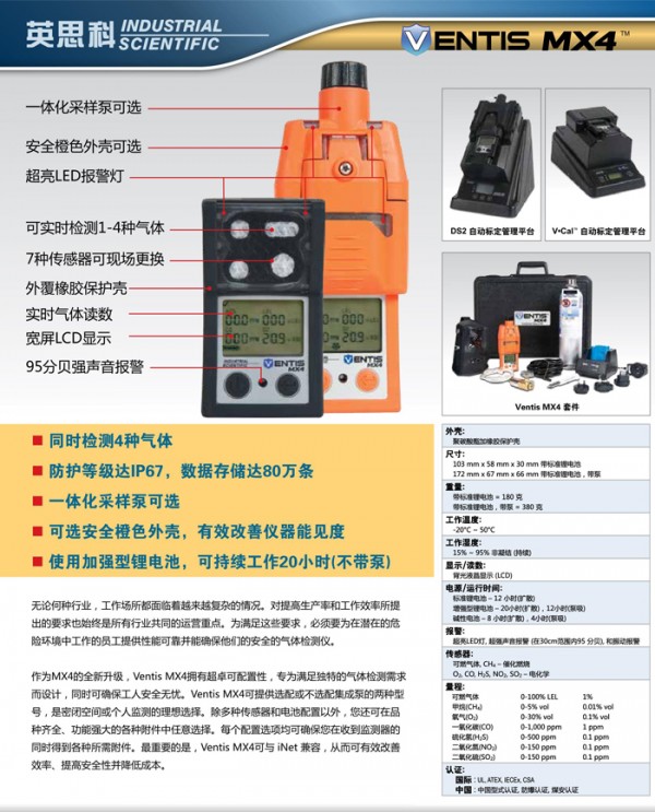 山东地区 英思科MX4 煤气四合一检测仪是美国英思科产品新研究设计的一款带有煤安认证的复合气体检测仪,MX4多气体检测仪是美国原装进口的一款四合一气体检测仪,与M40相比MX4可以检测氧气、可燃气体和两种有毒气体(CO、H2S、NO2、SO2)。MX4是一款理想的个人便携式多气体检测仪,体积小,耐用并且操作简单。MX4使用的是耐冲击聚碳酸酯外壳加橡胶外覆保护壳,非常牢固,通过第三方认证的IP66和IP67防护等级。优异的防尘防水性能使其可以在非常恶劣的环境中使用。