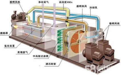 转轮吸附浓缩装置采用吸附-浓缩-脱附焚化三项连续程序,主要用于有机废气的治理;特别适合于大风量,低浓度场合。该吸附装置以陶瓷纤维为基材,做成蜂窝状的大圆盘轮状系统,表面涂覆疏水性沸石做吸附剂。转轮吸附浓缩装置主要由废气预处理系统、转轮浓缩吸附系统、脱附系统、冷却干燥系统和自动控制系统等组成。