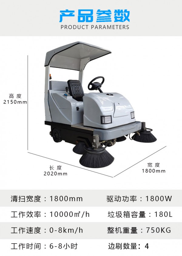 ●四只边刷,扫地宽度为1800mm,工作效率高;
