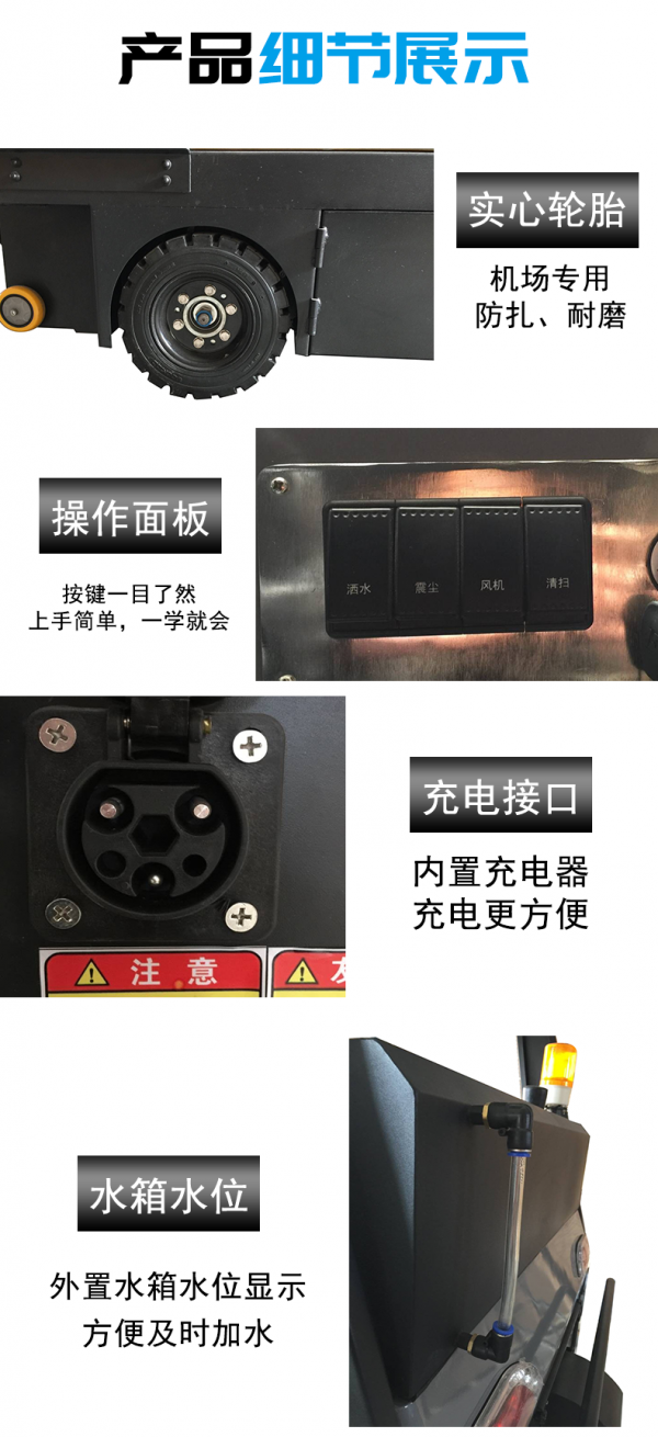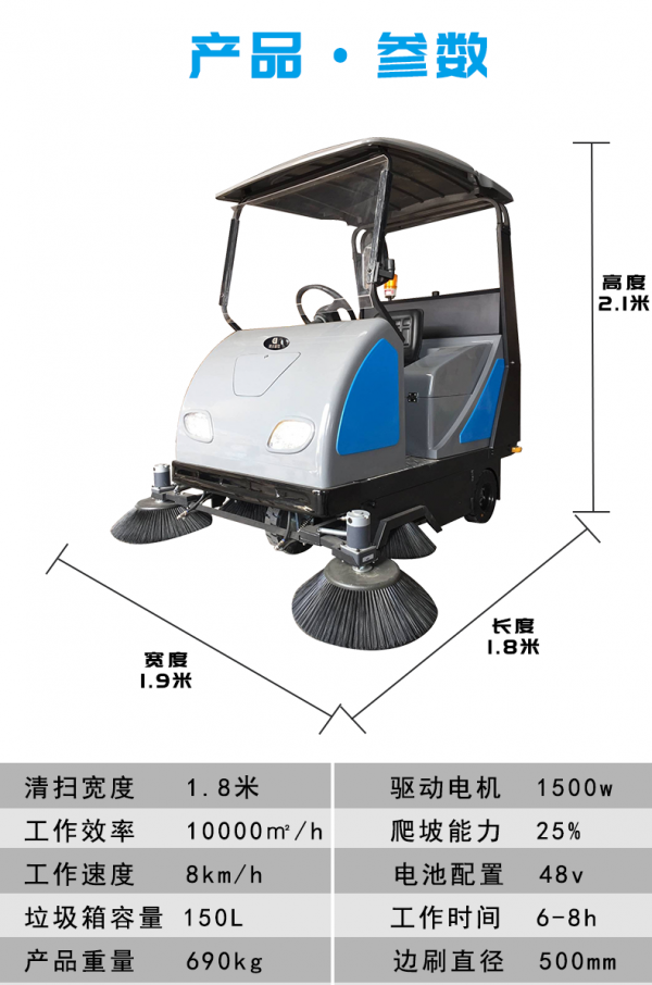l 内置直流无刷风机,吸力强劲。边刷电机,100r/min转速,清扫效果好。扫地宽度可达1800mm。