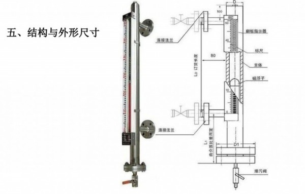 磁翻板液位计主体外的翻板箱受主体内浮子(具有定向磁性源,按不同介质和压力针对研制)的作用促其翻板翻动并显示红白颜色,并随浮子的移动指示不同的液面高度。在指示器左侧配有醒目的刻度标尺,从而使液位的指示显得更加清晰。