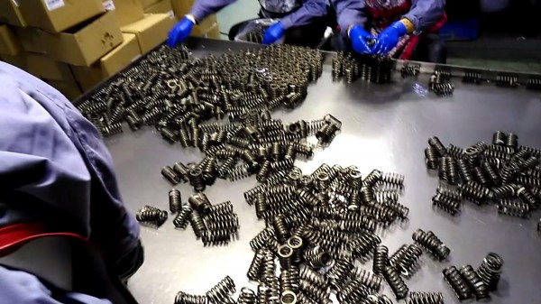 气门弹簧的生产工序:卷簧-回火-磨簧-倒角-次抛丸-第二次抛丸-压缩-负荷分选-包装