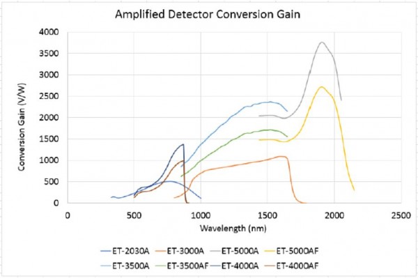 EOT 10GHz放大光电探测器内置的PIN光电二管,通过光伏效应将光功率转换成电流。固定增益的互阻放大器可以测量<1mw的功率输入。当通过50欧姆电阻连接到示波器时,可以测量激光器的脉宽。当通过50欧姆电阻连接到光谱分析仪时,可以测量激光器的频率响应。
