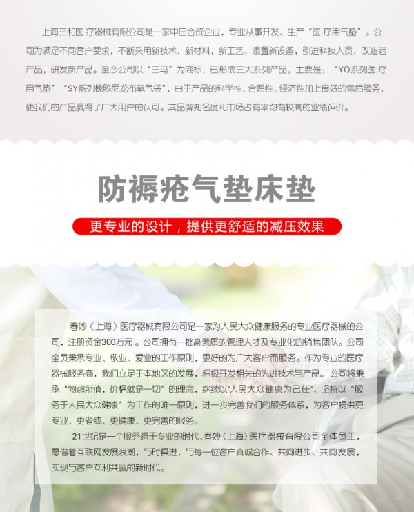 上海三和医疗器械有限公司是一家中日合资企业,专业从事开发、生产“医疗用气垫”。公司为满足不同客户要求,不断采用新技术,新材料,新工艺,添置新设备,引进科技人员,改造老产品,研发新产品。公司以“三马”为商标,已形成三大系列产品,主要是:“YQ系列医疗用气垫”“SY系列橡胶尼龙布氧气袋”,由于产品的科学性、合理性、经济性加上良好的售后服务,使我们的产品赢得了广大用户的认可。