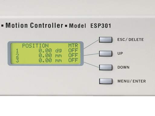 ESP301 包括一个用户友好的前面板界面,提供一个直观的菜单系统,可用于执行运动程序、启动手动移动和配置操作参数。所有轴的位置均显示在 LCD 屏幕上。附加的数字操纵杆可以提供方便的点动控制。通过 ESP301 的手动界面,可以在不使用计算机的情况下执行运动。