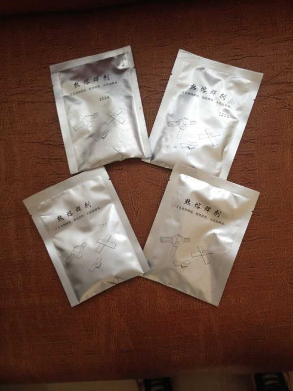 放热焊接焊剂是一种灰色的粉末状物,一般常见的规格有:#90号、#115号、150号、200号、250号和300号放热焊剂。放热焊剂的号数就是每包的克数,一包放热焊接焊剂配引药一包,一个金属隔离片。