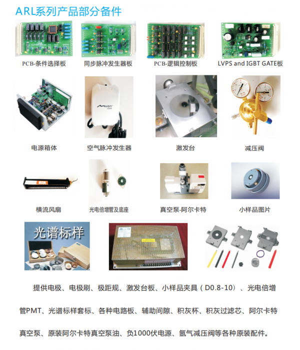 提供电、电刷、距规、激发台板、小样品夹具( D0.8-10)、光电倍增管PMT、光谱标样套标、各种电路板、辅助间隙、积灰杯、积灰过滤芯、阿尔卡特真空泵、原装阿尔卡特真空泵油、负1000伏电源、氩气减压阀等各种原装配件。
