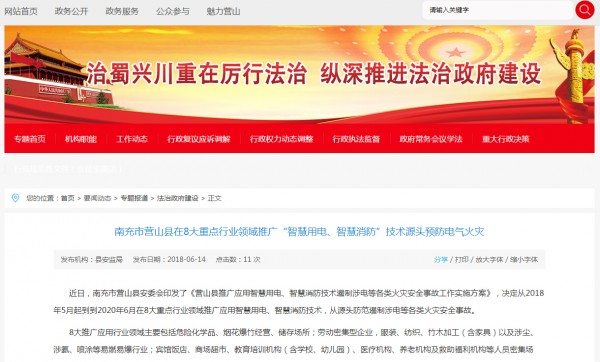 近日,南充市营山县安委会印发了《营山县推广应用智慧用电、智慧消防技术遏制涉电等各类火灾安全事故工作实施方案》,决定从2018年5月起到到2020年6月在8大重点行业领域推广应用智慧用电、智慧消防技术,从源头防范遏制涉电等各类火灾安全事故。