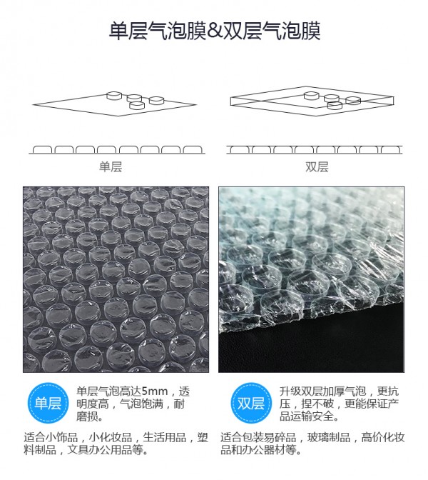 气泡袋分单面和双面两种,单面汽泡袋适宜保护自身重量较轻的产品,双面汽泡袋防震力强适合体积较大较重之物品包装。单、双面汽泡袋均适合各行业产品的包装如做袋、切片。单、双面汽泡袋可设防静电汽泡袋,以及不同颜色、印刷.还可复合其它材料增加保护性及美观。