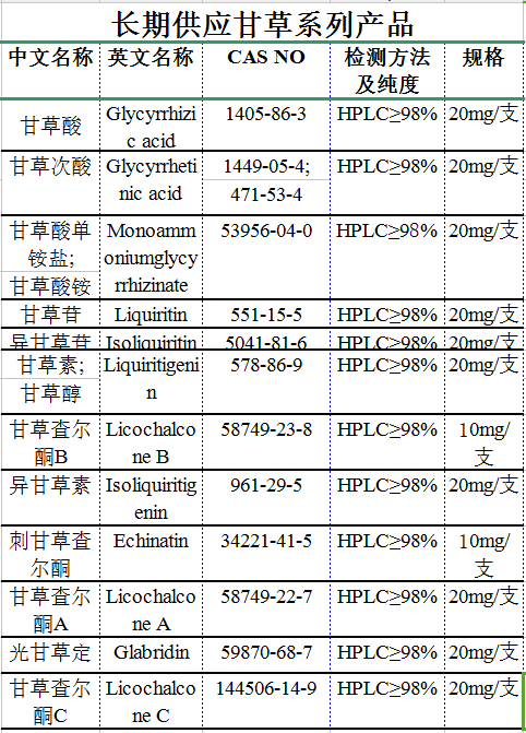 提取来源: 草本豆科植物甘草(Glycyrrhizae)的根