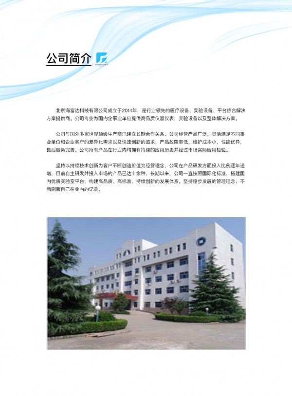 东方化玻(北京)科技有限公司成立于 2014 年,是实验设备、平台综合解决方案提供商。公司为国内企事业单位 提供高品质仪器仪表,实验设备以及整体解决方案。 公司与国内外多家世界生产商已建立长期合作关系。公司经营产品广泛,灵活满足不同事业单位和企业客户的差异化需求 以及快速创新的追求,产品故障率低,维护成本小,性能优异,售后服务完善。公司产品在行业内均拥有持续的应用历史并 经过市场实际应用检验。 坚持以持续技术创新为客户不断创造价值为经营理念,公司在产品研发方面投入比例逐年递增,目前自主研发并投入市场 的产品已达十余种,长期以来,公司一直按照标准,搭建实验室平台,构建高品质、高标准、持续创新的发展体系。 坚持稳步发展的管理理念,不断刷新自己在业内的记录。