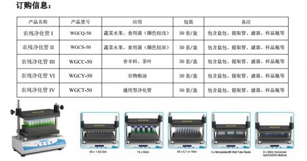 QuEChERS农残分析净化管产品规格说明:每套WG-QUECHERS净化包包含:1个提取管、1个盐包、1个滤器、1个样品瓶。