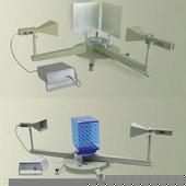 本实验仪采用类似光学分光计的设计思想。成套仪器由三厘米微波信号源、固态微波振荡器、衰减器、隔离器、发射喇叭、接收喇叭、检波器、检波信号数显器、可旋转载物平台和支架,以及其他实验用附件(反射板、分束板、单缝、双缝、晶体模型等)等组成。