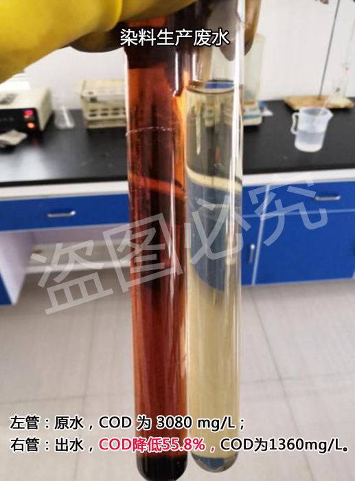 9、染料生产废水:染料生产废水产品种类繁多,微电解主要作用是脱除色度,降低COD,提高可生化性。一般微电解+芬顿相结合,COD去除率在40-50%左右。