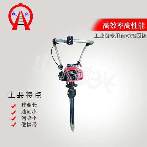 捣固镐采用汽油机与捣固棒直接连接的设计,主要由汽油机、减振装置、传动轴、振动体和手把组成。其工作原理为:汽油机经离合器、软轴带动偏心铁,产生振幅实现捣固作业。