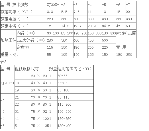 二、产品型号及其意义 ZJ20X系列轴承加热器主要技术参数 主要技术参数见表1 轭铁规格见表2