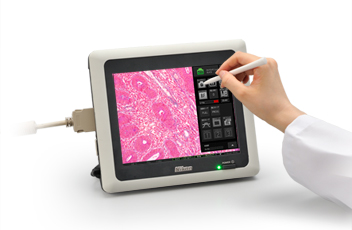 配有大尺寸显示屏的控制器可以直接完成图像拍摄,而无需使用计算机。通过使用触摸屏上的场景模式图标选择观察方法,即可完成Digital Sight 相机的简易设置和操作。可以使用测量两点之间的距离等简易测量功能。另外,还可以进行物镜切换和Ci-E 聚光镜设置。通过网络功能,可以在观察期间在多台远程PC上共享实时图像。