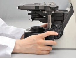 通过物镜转换器垫片可将载物台高度从标准位置降低20 mm,以便轻松更换标本,同时保持舒适的姿势。