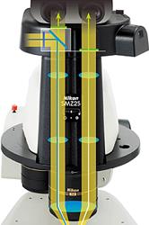 尼康开发的光学系统即使在高倍下亦可以大大地提升了图像信噪比。此系统甚至可用于细胞分裂的拍摄,而此功能使用传统的体式显微镜是较难做到的。
