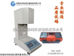 此款仪器型号为XNR-400B,配有自动切料装置(同时配有手动切料功能);配有微型打印机设备,打印测试结果;自动计算功能,将质量输入即可测得质量法测试结果,存储20份试验结果。