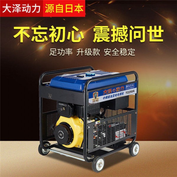 250A发电电焊机说明: 大泽焊机搭载单缸进口发动机,功率、重量轻、体积小,与同及别焊机相比,出力高出40%;发电方式采用诱导子技术,电压稳定,飞溅小,手感细腻、流畅,设备仪表齐全,配有省油电磁阀、电流高低档选择开关