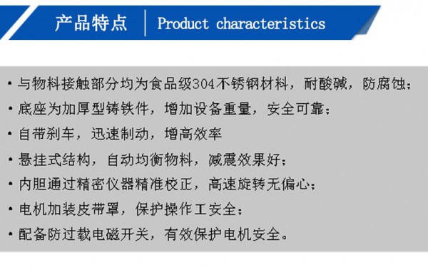 3、离心脱水机内胆、外筒均采用国标304不锈钢板制成,耐酸、耐碱,经久耐用,使用寿命长。