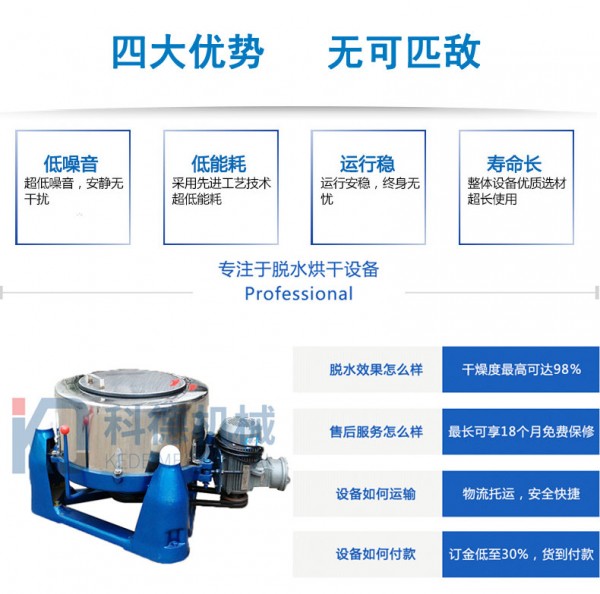 全新一代节能环保型离心脱水机介个特点 现货上市科德HCD系列离心脱水机内胆外壳采用优质不锈钢制作,耐腐性能高。运转平稳、平衡性好、噪音低、脱水率次高。采用柔性启动、制动技术,适用寿命长。具有容量大、防震、变频、自动系统。离心脱水机适用于服装洗涤、针织、棉、麻、漂染、化工、医院、宾馆、酒店、工矿等行业脱水