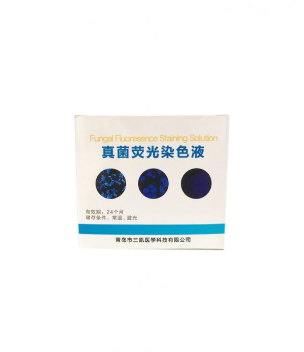 真菌荧光染色液是一种快速检测真菌感染的染色液。试剂中的荧光染料与真菌细胞壁几丁质、纤维素结合而将真菌染色,在紫外光的激发下,显现强荧光。通过荧光显微镜观察荧光或形态,判断真菌的存在。
