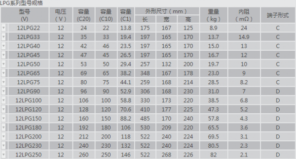 法国路盛12LPG100蓄电池型号大全报价参数设计浮充寿命:15年@25℃浮充电压:13.26-13.50 V/节 @25℃,温度修正-20mV/℃均衡充电:13.8-14.4 V/节 @25℃,温度修正-25 mV/℃循环使用充电电压:14.4-15.0 V/节 @25℃,温度修正-30mV/℃大电流:0.25C1080%深度循环充放电次数:约650次自放电率:≤1% 每月